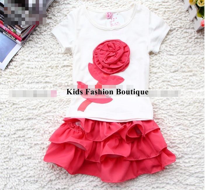 Girls Ivory & Coral Pink Flower Top and Ruffle Skirt Outfit. 100% Cotton.